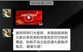 研究生環(huán)境生態(tài)班黨支部以線上微課的形式展開活動(dòng),每周選定一位主講人,錄制3-5分鐘微課,14位黨員成為活動(dòng)的主講人,分享了劉永坦院士、盧永根院士、黃大年教授、郭天財(cái)教授、屠呦呦院士、竺可楨院士等優(yōu)秀科學(xué)家黨員的事跡及科學(xué)家精神。學(xué)生黨員用通俗易懂的語(yǔ)言,為支部成員分享了一個(gè)又一個(gè)生動(dòng)的優(yōu)秀共產(chǎn)黨員事跡,進(jìn)一步弘揚(yáng)了科學(xué)家精神。
