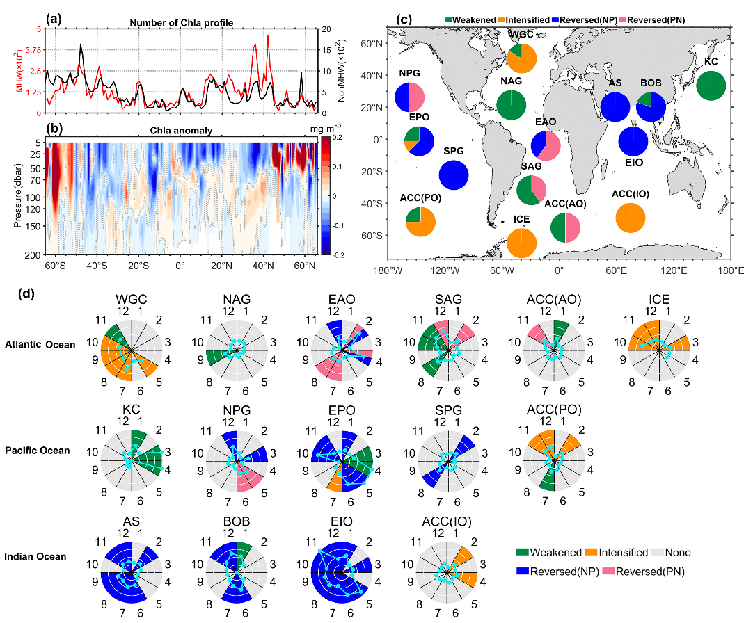 a:海洋熱浪(MHW)期間(紅線)與非 MHW 期間(黑線)葉綠素 a 剖面數量的緯向分布。b:全球海洋中葉綠素 a 濃度異常的緯向分布。c:基于 BGC-Argo 觀測,15 個區域內海洋熱浪期間不同類型垂直葉綠素 a 異常的比例分布。綠色表示減弱型(Weakened)、黃色表示增強型(Intensified)藍色和粉色分別表示兩類次表層反轉型(NP 和 PN)。d:海洋熱浪期間各月主導的垂直葉綠素 a 異常類型(填色),以及各類型在當月 MHW 剖面中的占比(青色線條)。