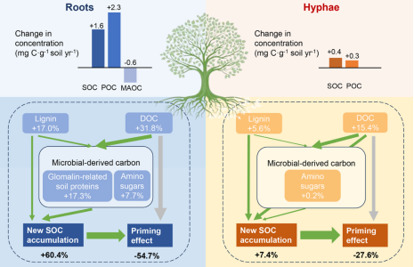 研究結果表明,根系對土壤有機碳的年均凈貢獻為1.2 mg C g?1土壤,是外延菌絲(0.32 mg C g?1土壤)的近4倍。根系不僅顯著促進新碳的固定,還可抑制原有有機碳的分解,從而實現土壤碳的凈積累。此外,根系輸入主要促進顆粒有機碳(POC)的積累。