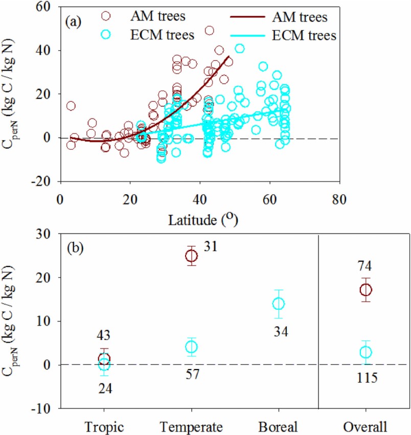 中國科學院華南植物園鼎湖山站博士后陳國茵、胡苑柳等科研人員,通過整合全球范圍內的123項氮添加實驗數據(涵蓋71個樹種,189組觀測),深入探究了不同樹種的生物量碳固存對氮添加的響應規(guī)律。同時,采用單位氮添加引起的樹木生物量碳增益(CperN)這一指標,以更準確地量化氮沉降的碳匯效應,并利用全球菌根樹木分布圖估算了菌根類型調控下的全球樹木碳固存潛力。