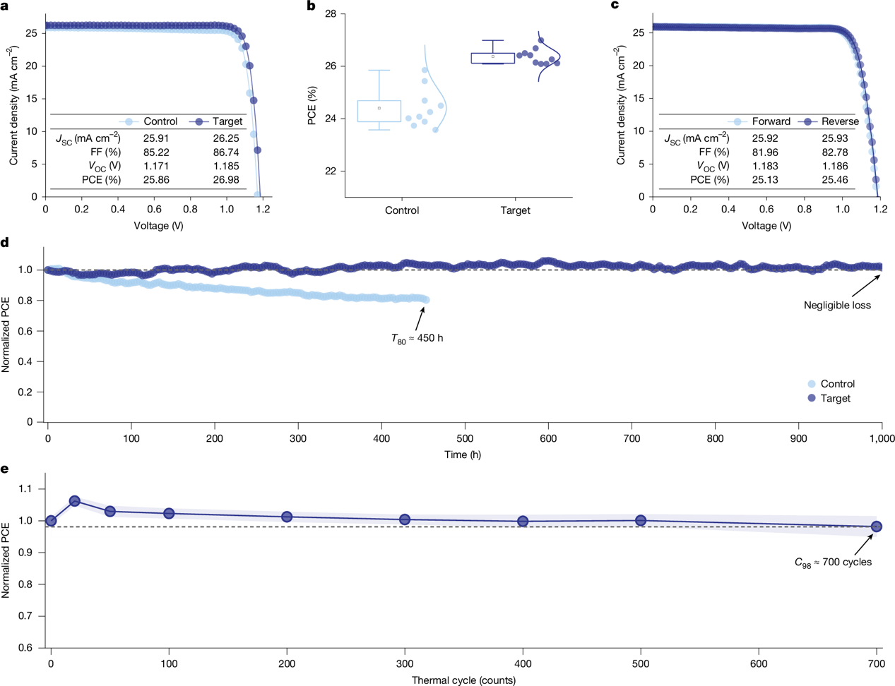 基于該方法制備的反式鈣鈦礦太陽能電池同時實現了26.9%的認證效率,且連續工作1,000小時后,效率零衰減(基于ISOS-L-2測試標準),并在–40°C至85°C之間經過700次重復熱循環后,仍能保持>98%的初始PCE,代表了該領域的頂尖水平(圖4)。