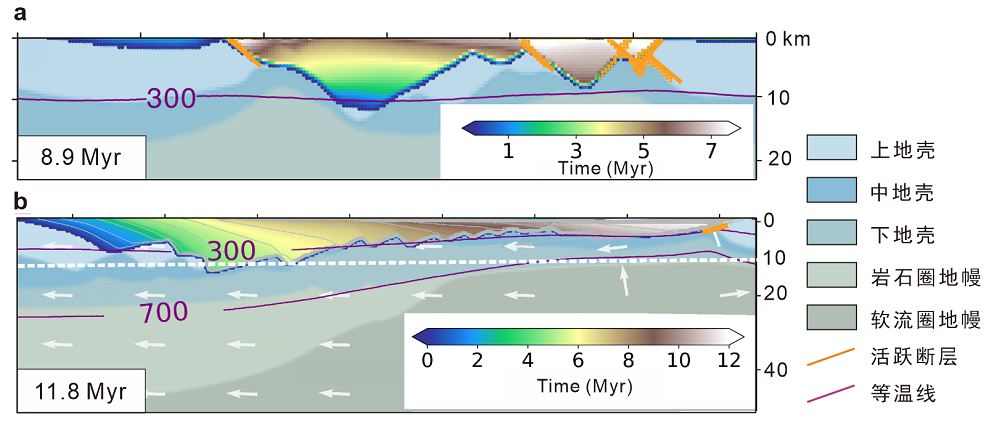 圖2?模擬結(jié)果表明:a)當(dāng)表層堆積物密度較低(2500 kg/m3)時,易形成對稱式共軛斷層;b)而當(dāng)堆積巖漿密度較高(2900 kg/m3)時,則會在其底部發(fā)育向陸傾斜的斷層,進(jìn)而形成向海傾斜的反射層(SDRs)。
