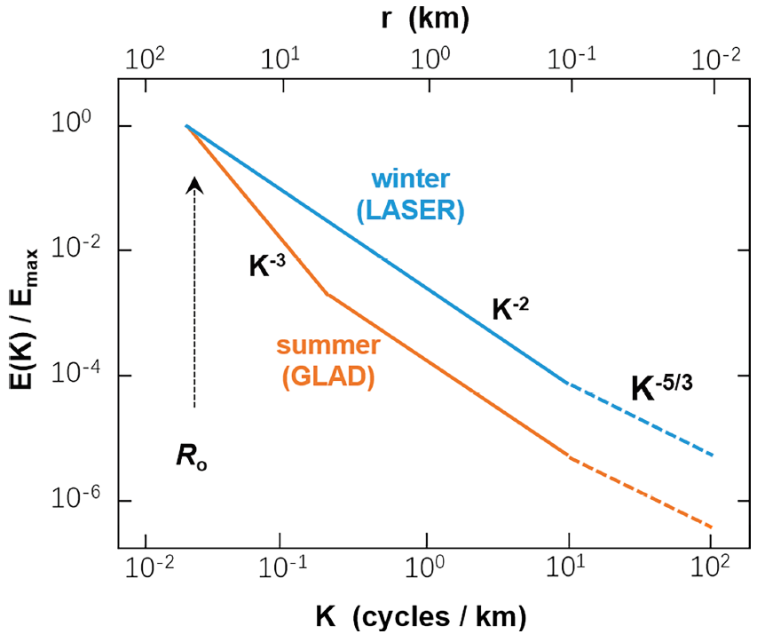 研究發現,從約100米至數公里尺度,動能能譜呈現K-2的依賴關系。能譜結構存在明顯的季節性差異:在冬季,K-2譜段可延伸至變形半徑(~50公里);而在夏季,在5-50公里尺度范圍內存在更陡的K-3譜段(與大氣上對流層能譜類似),其下(100米至5公里)仍為K-2譜。在100米以下尺度,分離統計量支持更淺的K-5/3(Richardson)能譜。研究還發現,在最初幾天或最小尺度(<1公里)上,“偶遇對”(chance pair)的擴散顯著快于“原始對”(original pair),這與初始距離與相對速度的記憶相關性有關,表明亞中尺度擴散研究需使用無偏的粒子對或三聯體投放策略進行更優化的觀測。此外,研究證明CIST和FAGR在分析亞中尺度擴散方面比傳統的FSLE更具優勢。